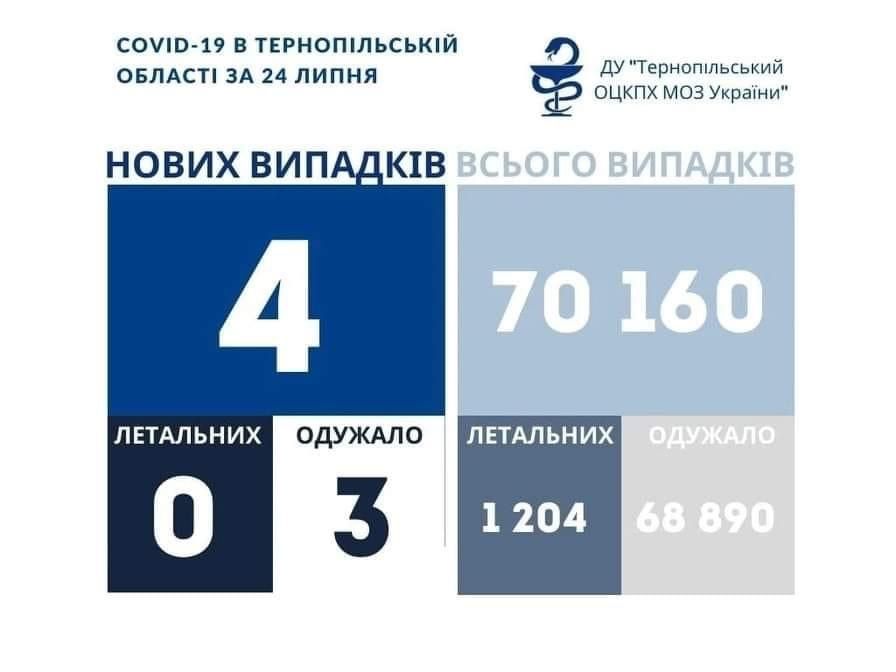 4 нових випадки коронавірусної хвороби COVID-19 зафіксовано в Тернопільській області за 24 липня 2021 року.